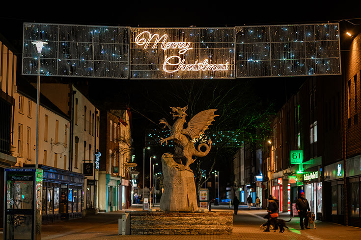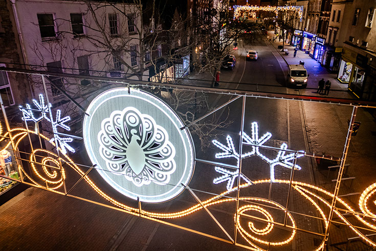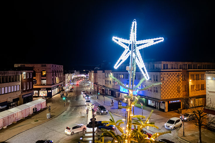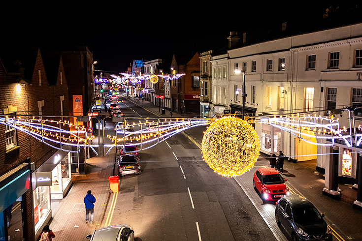 Although there was no formal theme, councillor preferences guided the direction of the scheme. We advised on the options and curated a design that would maximise visual impact across key areas of the town. The introduction of RGB satellite controlled light string globes, kinetic elements, and strobe technology brought movement, depth and a more contemporary feel to the display.